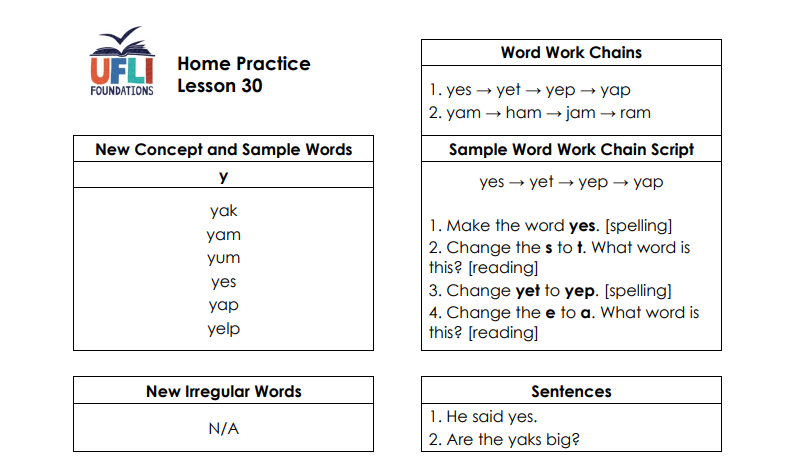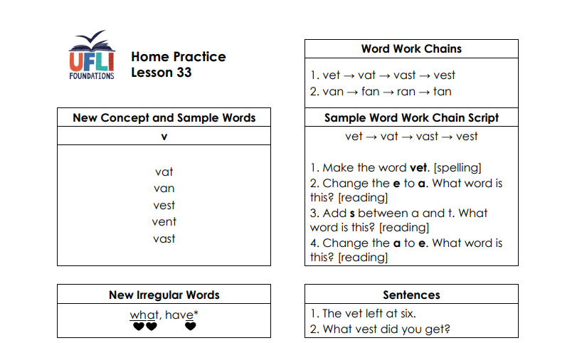 The UFLI Home Practice sheets provide a way for students to build literacy skills at home in a way that directly connects to what they're learning at school. Here is a step-by-step explanation of how you can use these sheets with your learner. The home practice sheets will start coming home with lesson 5.