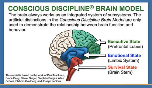 Conscious Discipline empowers us to be conscious of brain-body states in ourselves and children. It then provides us with the practical skills we need to manage our thoughts, feeling and actions. With this ability to self-regulate, we are able to teach children to do the same. By doing this, we help children who are physically aggressive (survival state) or verbally aggressive (emotional state) become more integrated so they can learn and use problem-solving skills (executive state). When we understand the brain state model, we can clearly see the importance of building our homes, schools and businesses on the core principles of safety, connection and problem-solving.