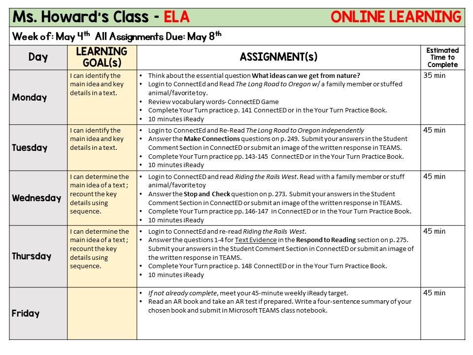 - Between 10:30 AM and 12:30 PM someone will be out at parent pick up and will take the work; otherwise, you will have to get out of their car and place the work in the appropriate bin.