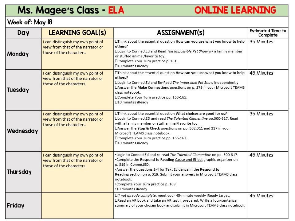 Welcome to our class information page! I am excited and ready to embark into the adventure of distance learning with you! Here you will find information about your assignments (Language Arts, Social Studies, and Special Area). There is also a celebration station to celebrate YOU and the wonderful goals you reach through our path in our new way of school!