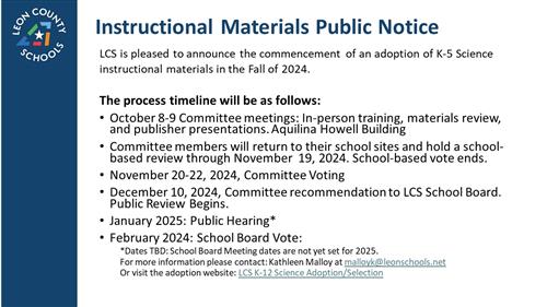 For information please contact: Kathleen Malloy at instructionalmaterials@leonschools.net