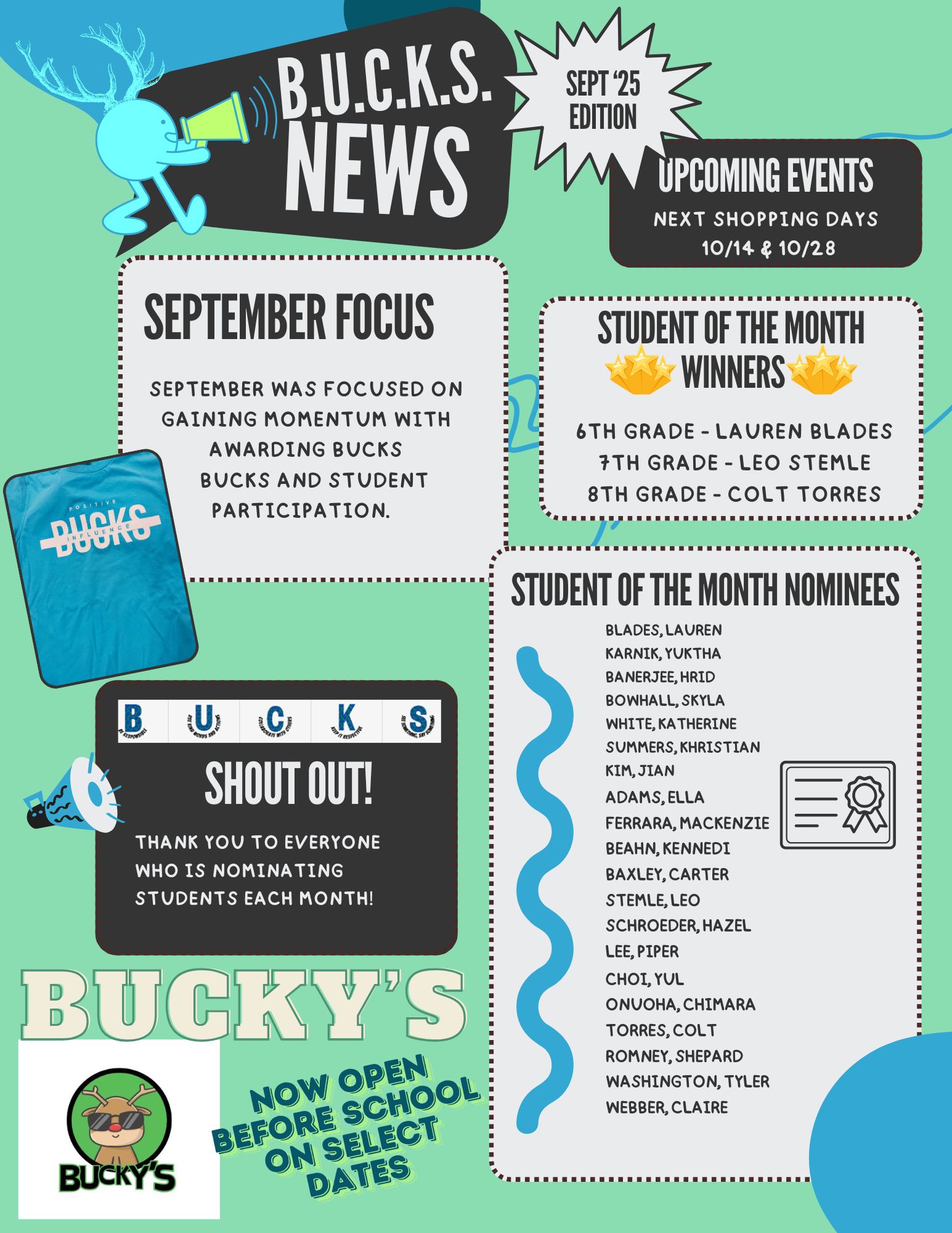 Teachers can reward students as needed, and parents can track their child's BUCKS totals in Focus, with adjustable notification settings available. Students can "cash out" their BUCKS for classroom rewards and Bucky's items (our PBIS School store). Teachers will individually determine their classroom reward "prices". Additionally, we will recognize a "Student of the Month" during morning announcements, with nominations from C-period teachers and a random draw by the grade level AP (one per grade level).